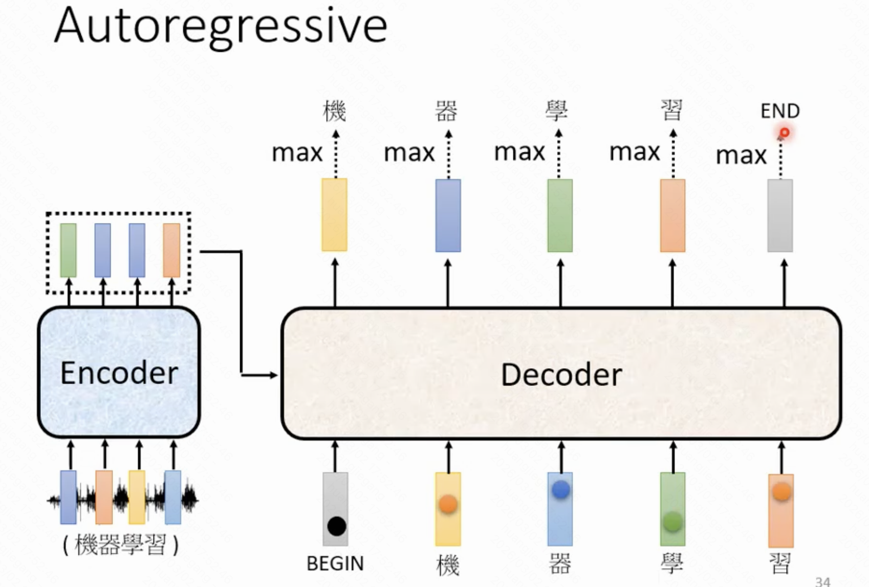 - 将前一轮的结果跟编码器的结果合并做一次self-attention