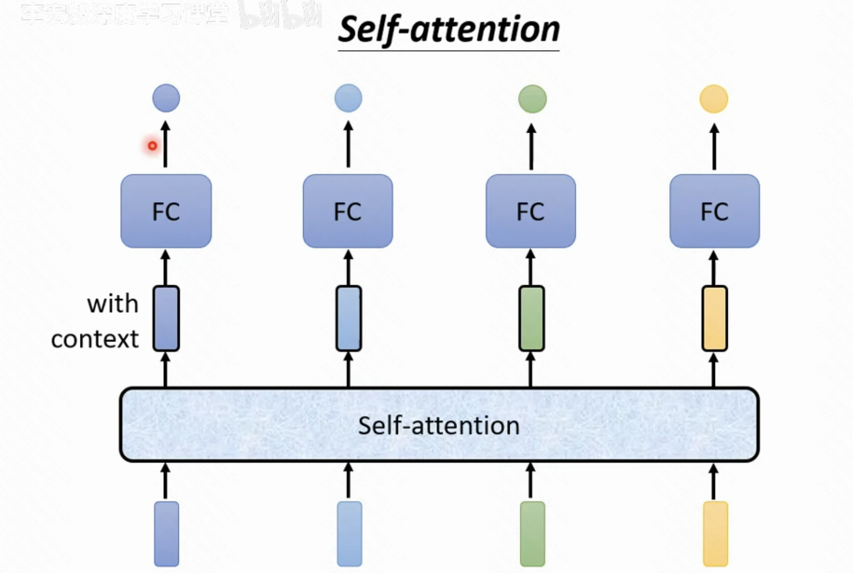如下图所示,self-attention可以当作一个处理黑盒,输入一个向量,经过attention处理后会给出一个相同长度的输出向量,attention只是用于综合整个输入信息,使得每一个位置的输出能参考到整体输入。因此attention并不是处理的结束,其输出的每一个元素还需要经过类似fully-connection network处理得到最终的输出。