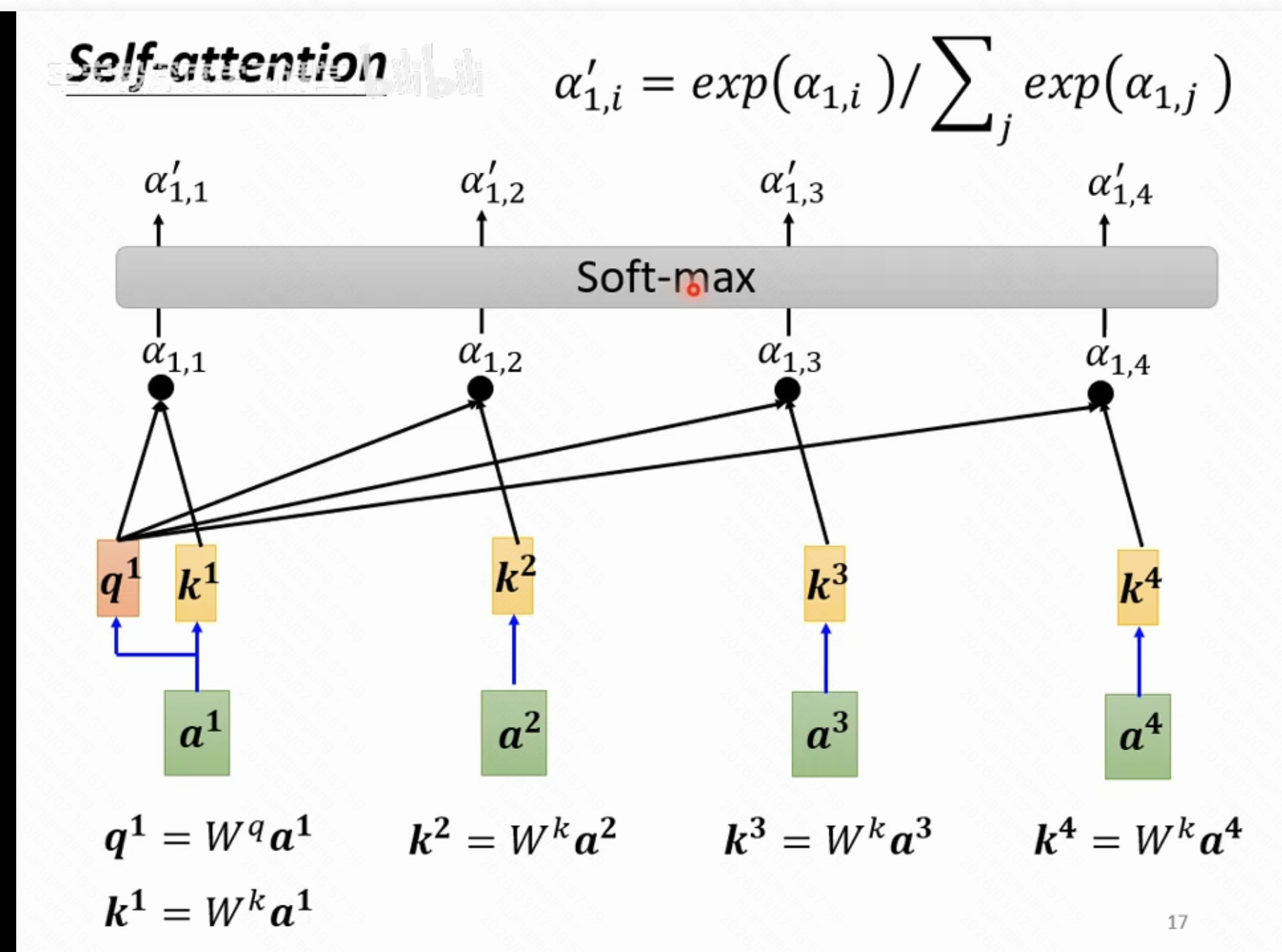 比如计算1号位置的输入和2号位置输入的attention,是通过q1和k2向量做点乘得到的,得到1号位置和所有位置的attention后,一般会做一个soft-max(理解为概率归一化),得到一个相加和为1的输出结果。